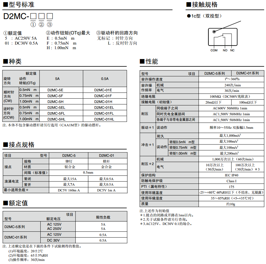 歐姆龍微動(dòng)開(kāi)關(guān)D2MC系列產(chǎn)品參數(shù):