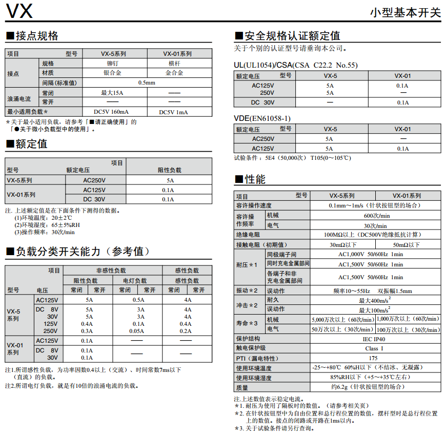 歐姆龍微動(dòng)開(kāi)關(guān)VX系列產(chǎn)品參數(shù):