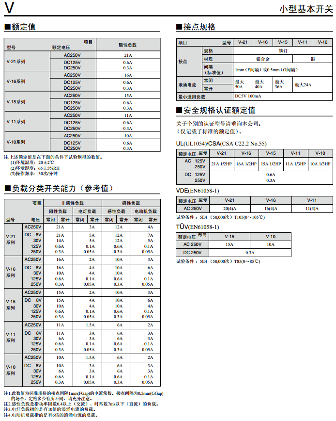 歐姆龍微動開關(guān)V 系列產(chǎn)品額定值/參數(shù):